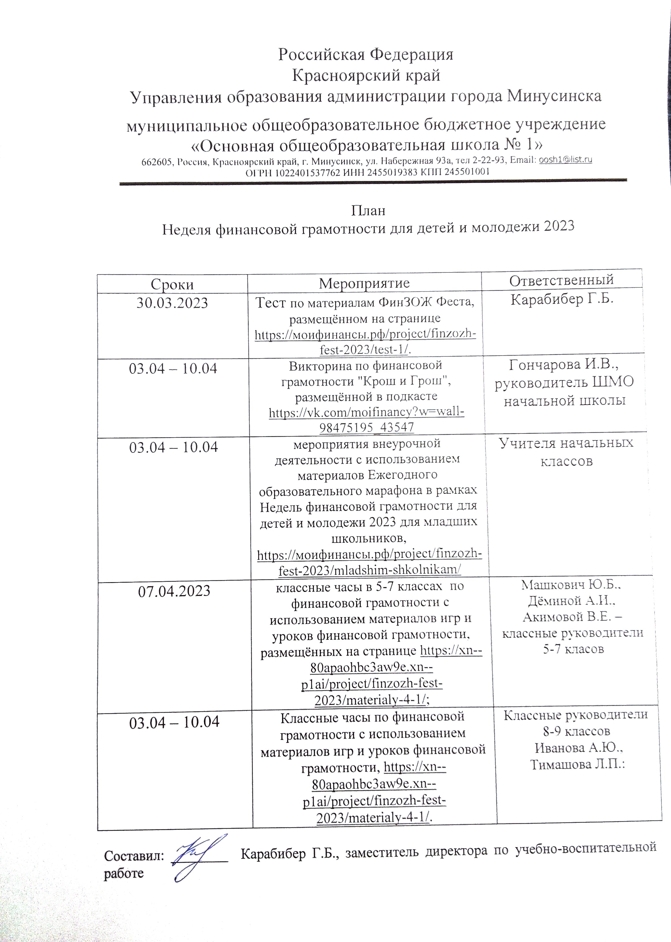 С 27 марта по 16 апреля , в рамках Всероссийских Недель по Финансовой грамотности для детей и молодежи , в нашей школе прошли классные часы "Крош и Грош" в 1-4 классах , в 5-8 классах прошли классные часы "Как не купить ненужное", в 8 и 9 классах прошли классные часы на тему "Что такое государственный бюджет, как он работает и какие вопросы решаются за счёт него "