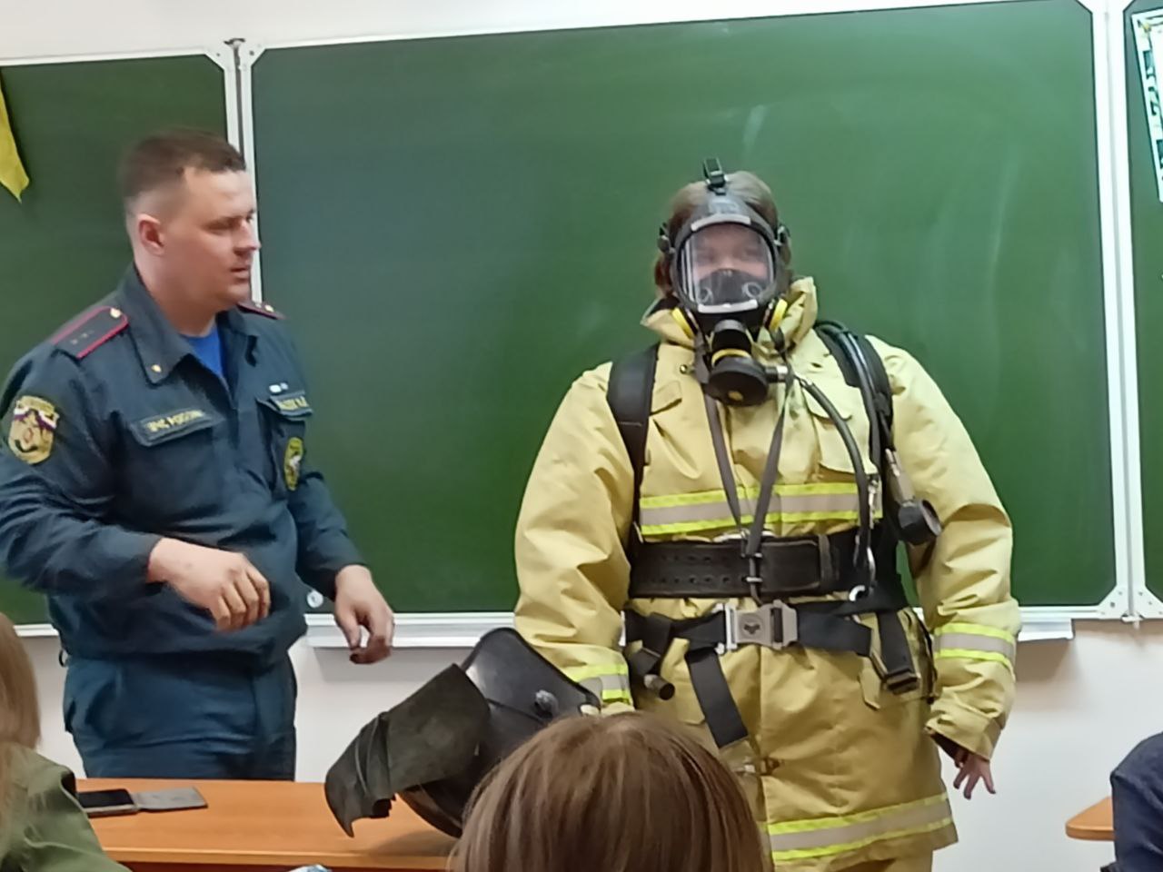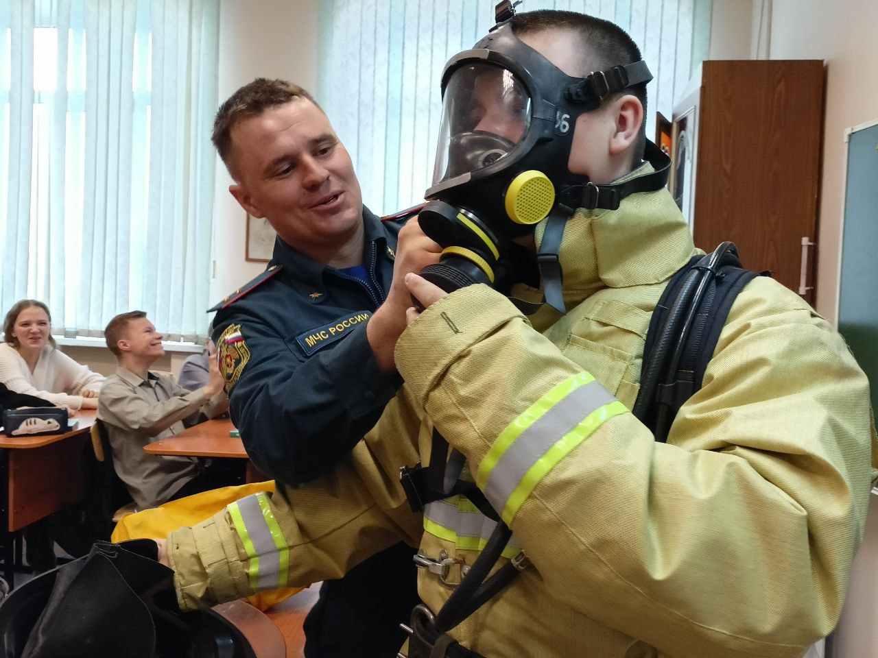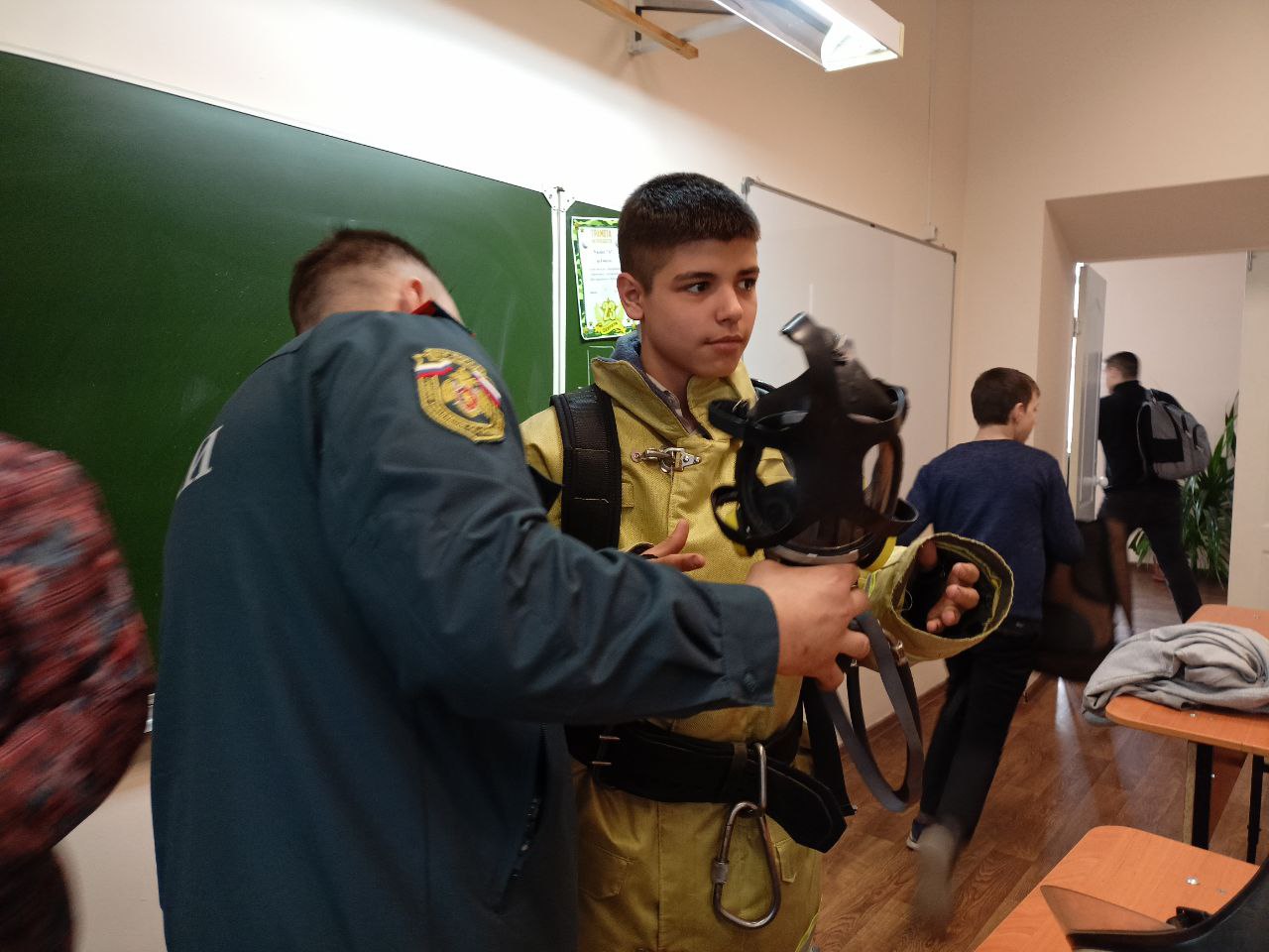 Также ребята имели возможность примерить защитный костюм пожарного.
